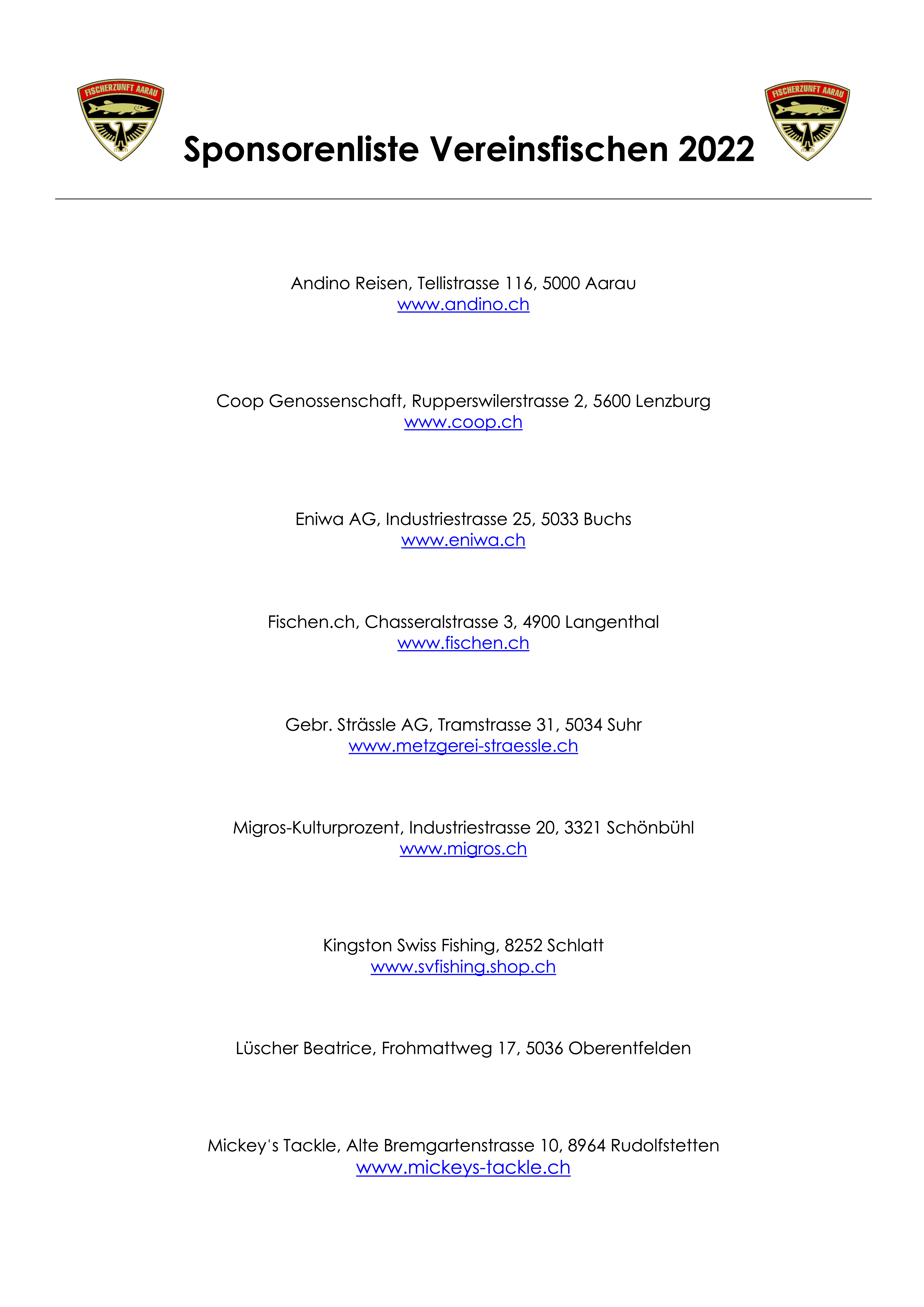 Die Fischerzunft Aarau bedankt sich bei allen Spendern von ganzem Herzen für die überaus grosszügigen Preise und bittet die Fischerzunft-Mitglieder die Sponsoren bei ihren Einkäufen zu berücksichtigen.